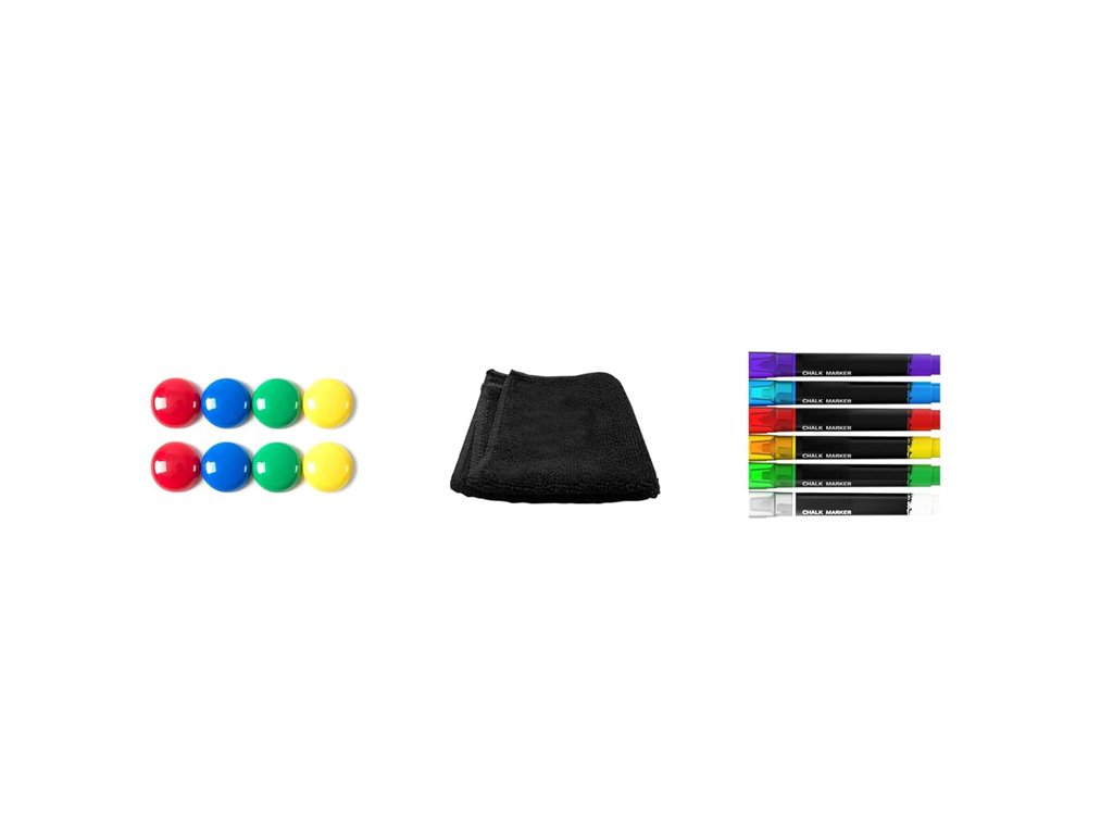 - Deluxe set: 6 barevných křídových fixů, 8 magnetů a hadřík na čištění