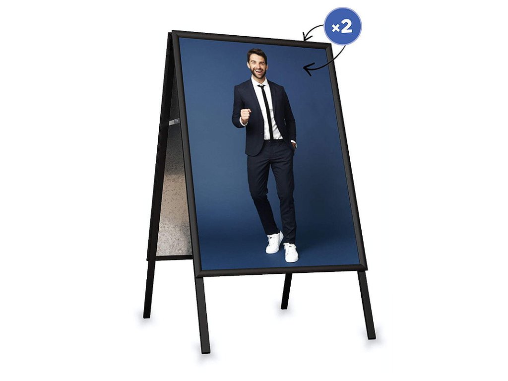 Elegantní a odolný reklamní A-stojan s černým eloxovaným hliníkovým rámem je ideální pro prezentaci plakátů, nabídek či oznámení.